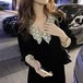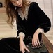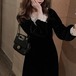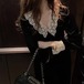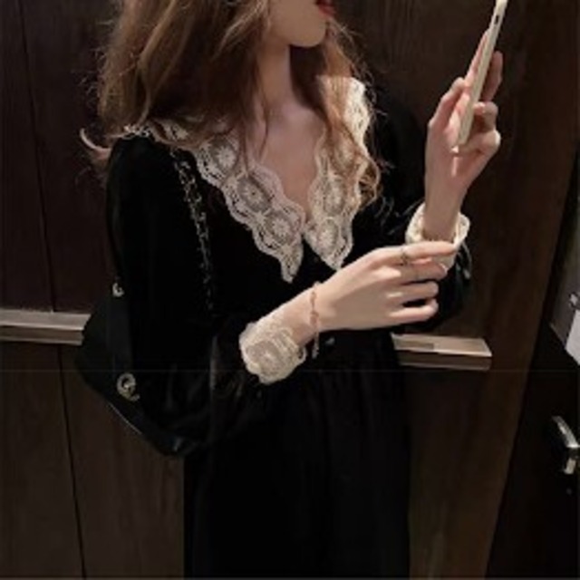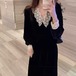 シックなベルベット素材♡襟と袖口にあしらったレースがエレガントなワンピース♡Aラインでミドル丈なので着回ししやすいデザイン♡