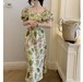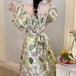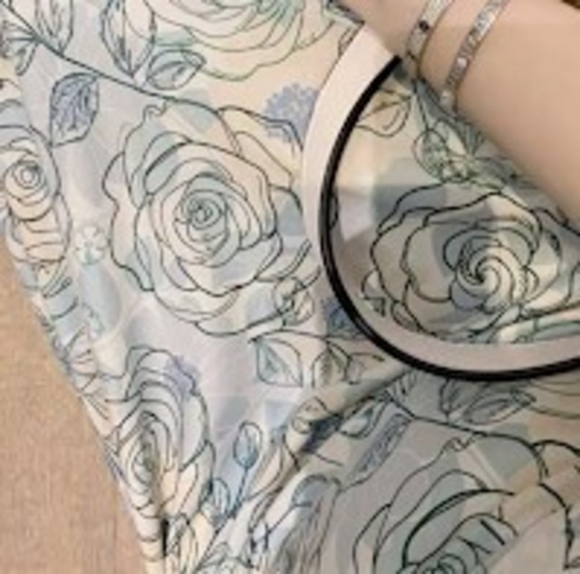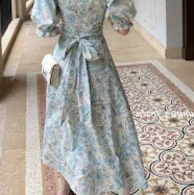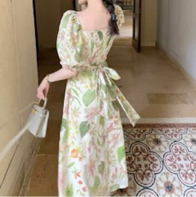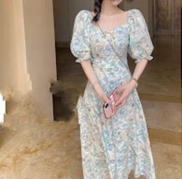 スクエアカラーのパフスリーブ♡春らしいプリントのワンピース♡グリーンのリーフプリント系とブルーのローズプリント系、どちらにするか迷うワンピース♡