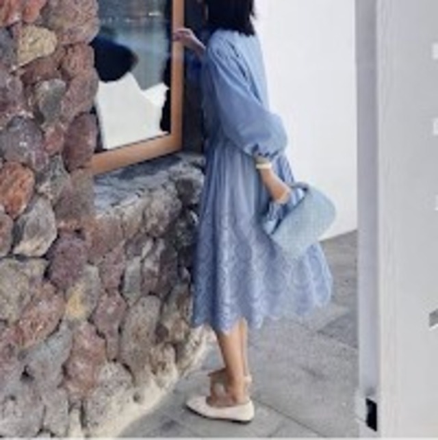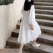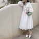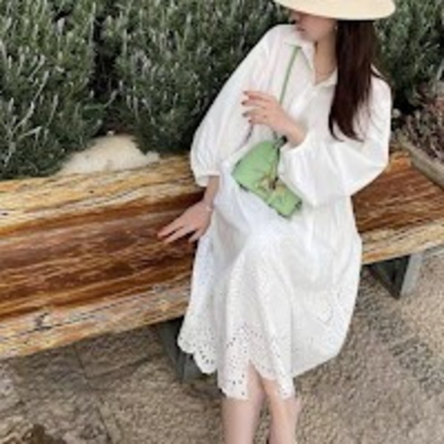 裾レースのデザインが大人カワイイ♡シャツカラーの清涼感とパフスリーブの女らしさ♡長袖なので着れる期間が長いワンピース♡