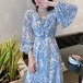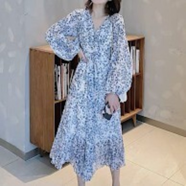 おとめな気分のブルーの小花柄のロングワンピース♡ふんわりなパフスリーブでシフォンのやわらかさを楽しんで♡