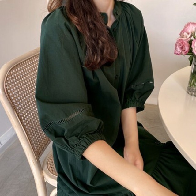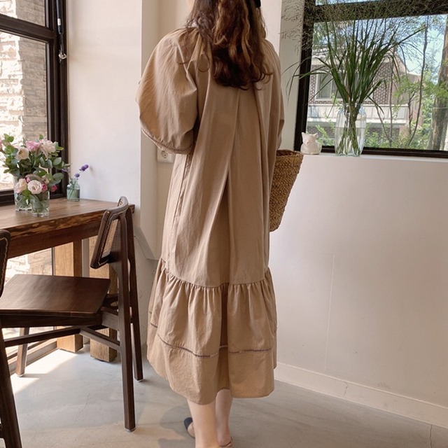 ルーズでランタンスリーブのロングワンピース♡袖口とスカートの裾にほどこされた「はしごレース」使いがなんともカワイイ♡