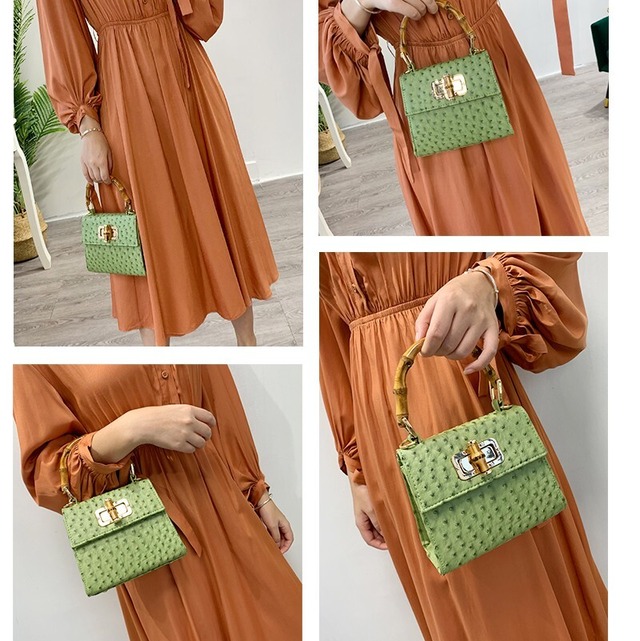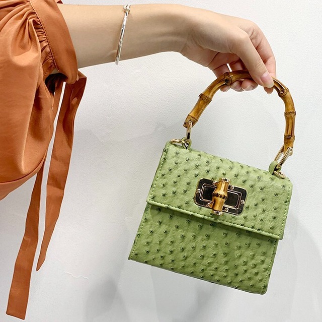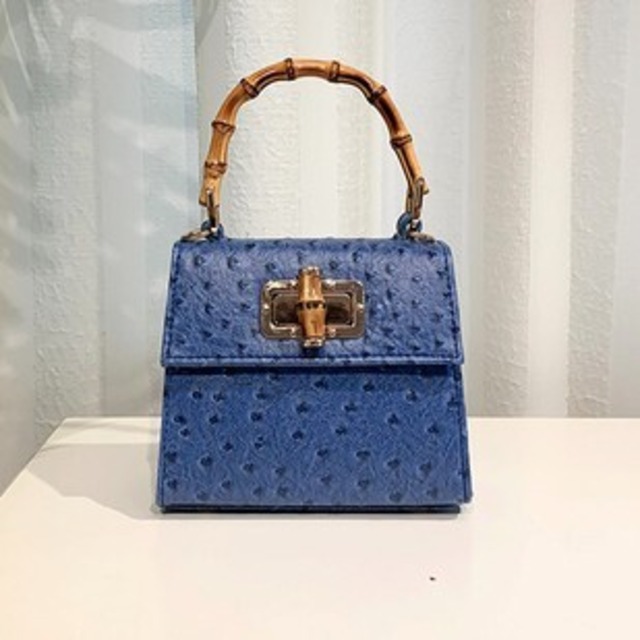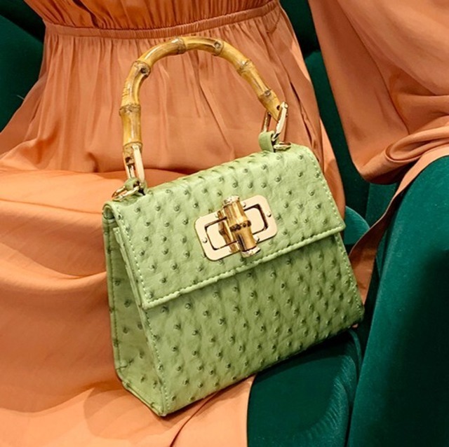 上品なフェイクレザーのオーストリッチの型押しとバンブーの持ち手がかわいいミニバッグ♡ちょっとしたお出かけに活躍します♡
