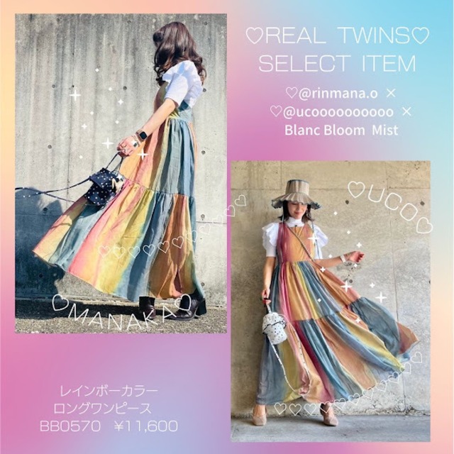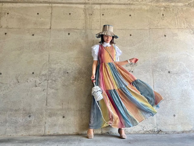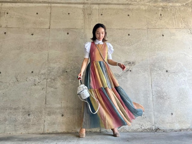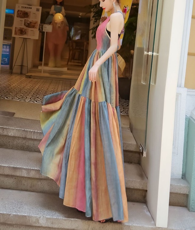 レインボーカラーが眼を引くゴージャスなワンピース♡Tシャツをレーヤードしてもステキに着こなせそう♡ロング丈が魅力的♡