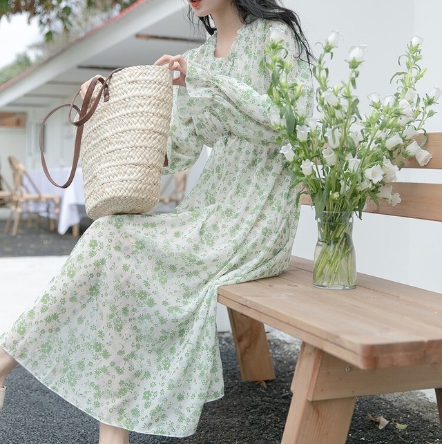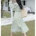 Vネックの襟元のフリルや袖口のギャザーがカワイイ♡長袖で小花柄のワンピース♡