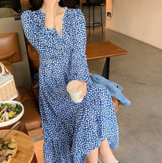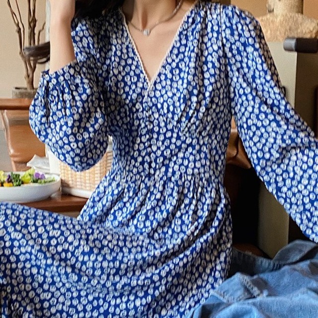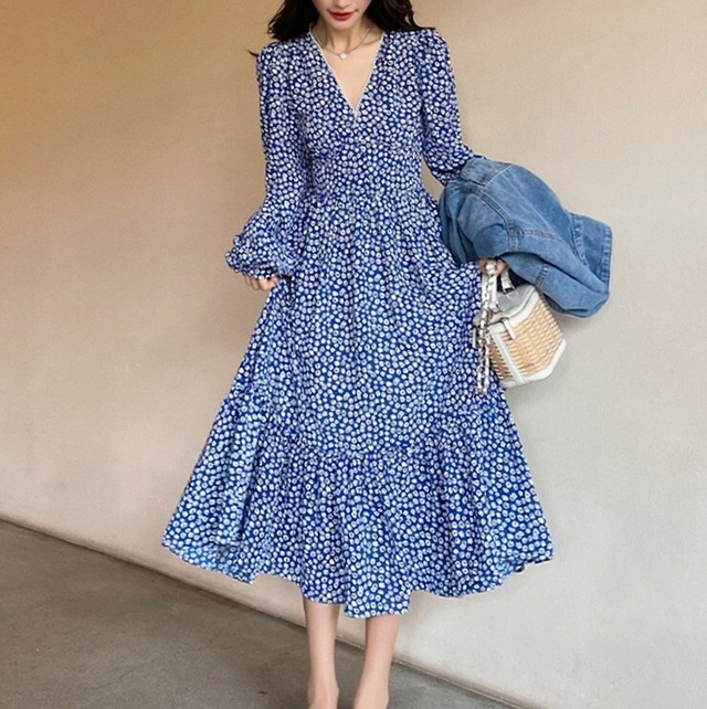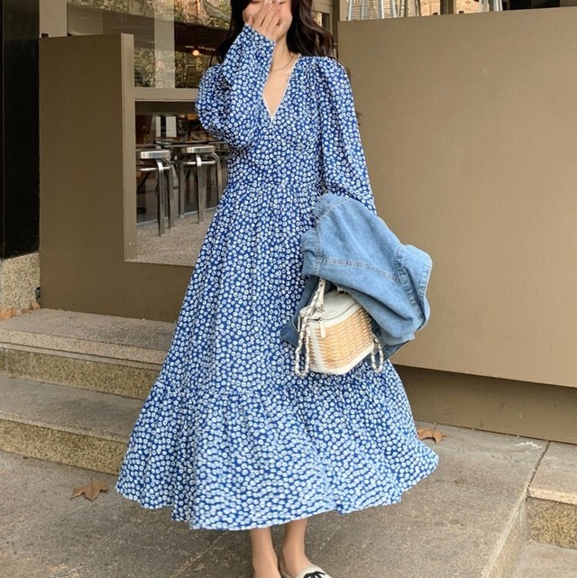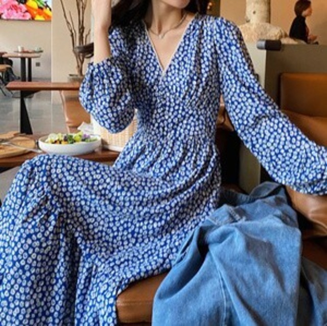 あざやか目のブルーの花柄がやや大人感♡長袖でVネックのワンピース♡ジージャンでドレスダウンもステキな着回し♡