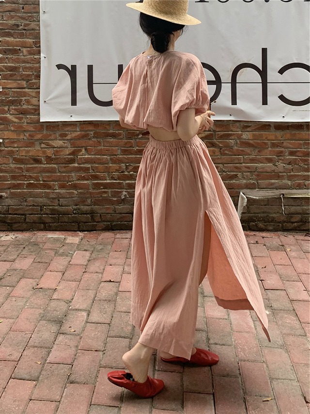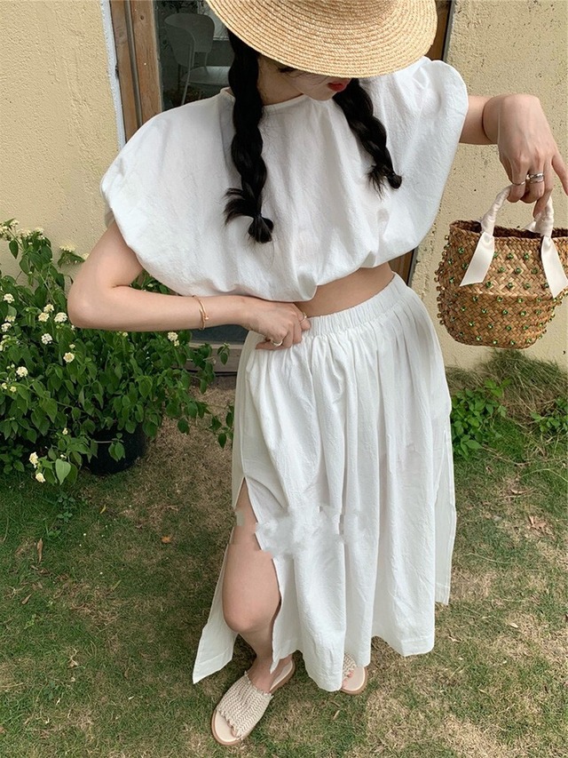 パフスリーブのブラウスとギャザースカートのセットアップ♡ちょっと甘さが漂うオレンジピンクと清楚なホワイトの2色展開♡