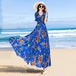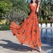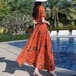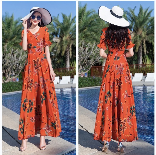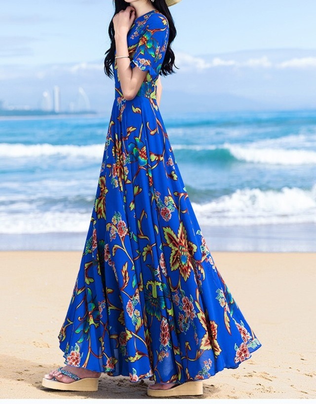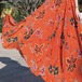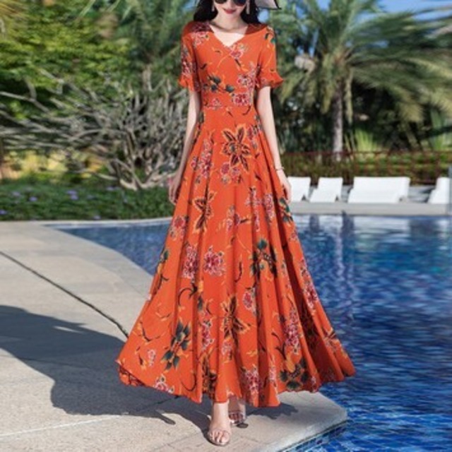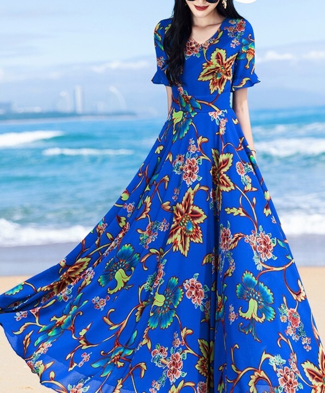 袖のフリルがカワイイ花柄のロングワンピース♡シフォンのやわらかいゴージャス感がステキ♡オレンジとブルーの2色展開。