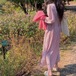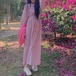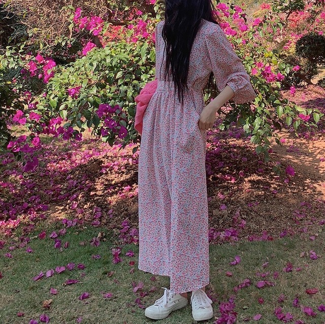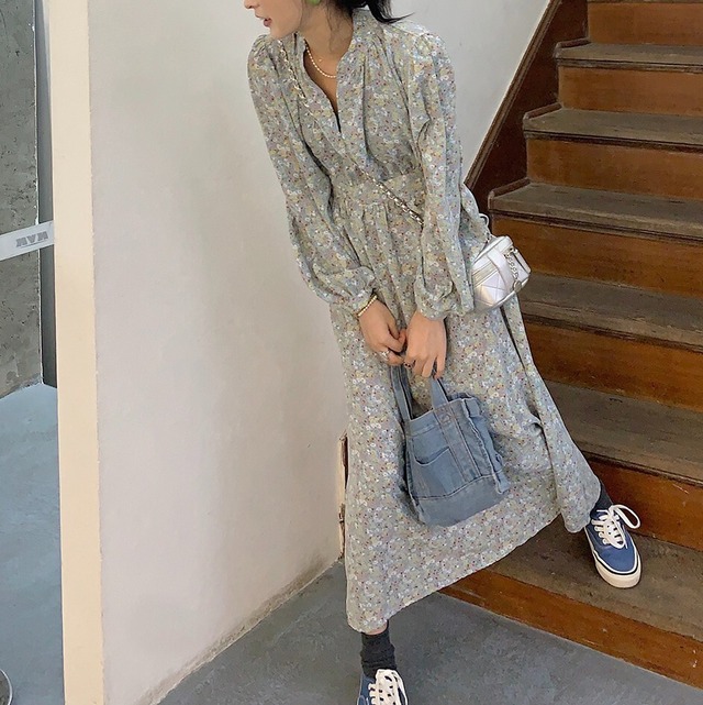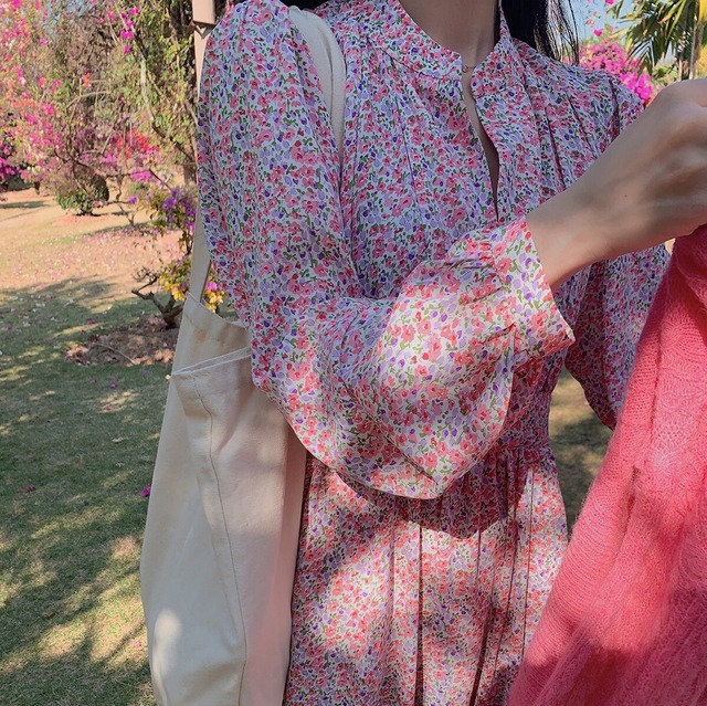 淡いトーンの小花柄のロングワンピース♡スタンドカラーからのギャザーやウエストのデザイン、控えめなAラインスカートが清楚感♡