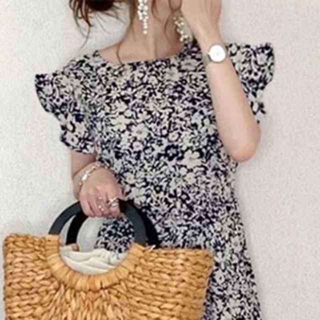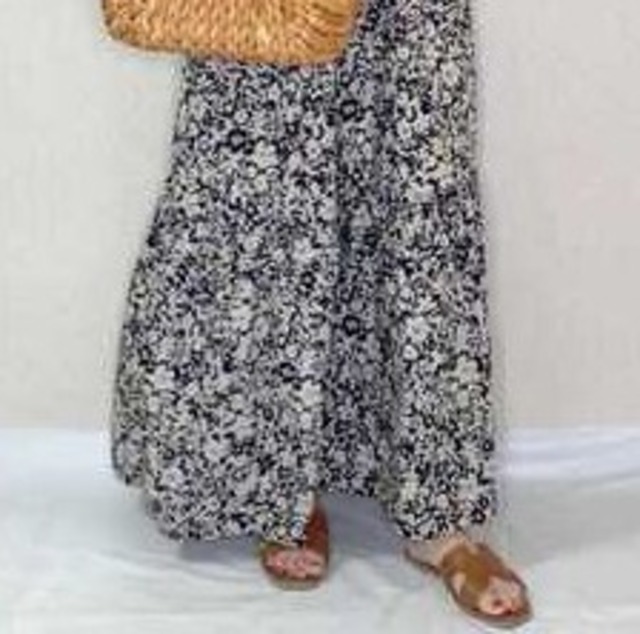 モノトーンの花柄♡フリル袖が大人カワイイ♡ラウンドネックのロングワンピース♡