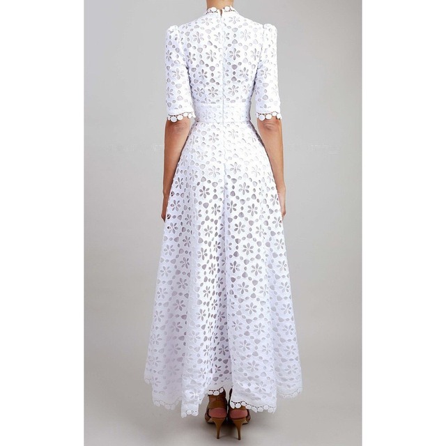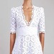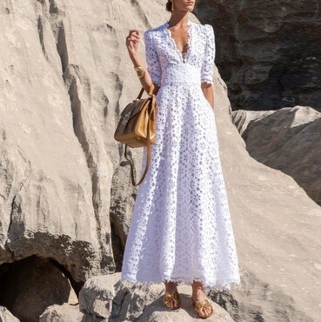 ハイエンドなレースのVネックワンピース♡ハイウエストなのでスタイルが良く見えます♡襟元、袖口、裾のレース使いも、とってもオシャレ♡