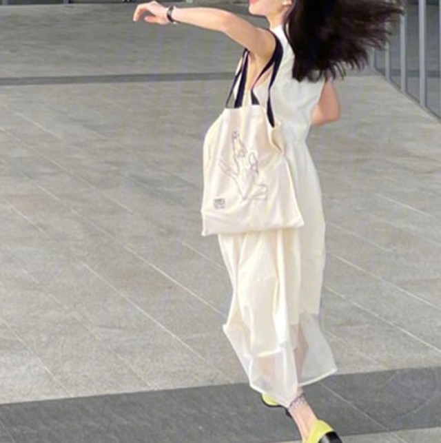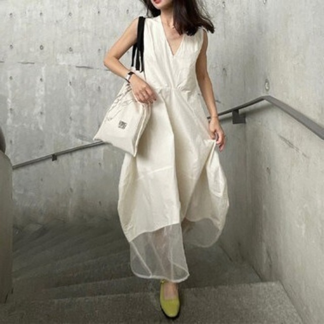 裾がシアーな白いノースリーブのワンピース♡Ⅴネックで上品でハイエンドな仕上がり♡小物やアクセサリーで着こなしの幅が広がるシンプルワンピース♡