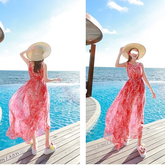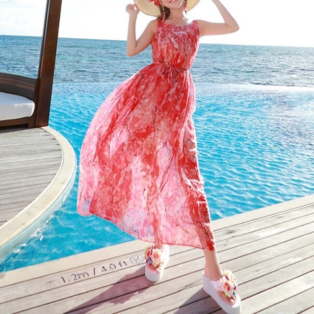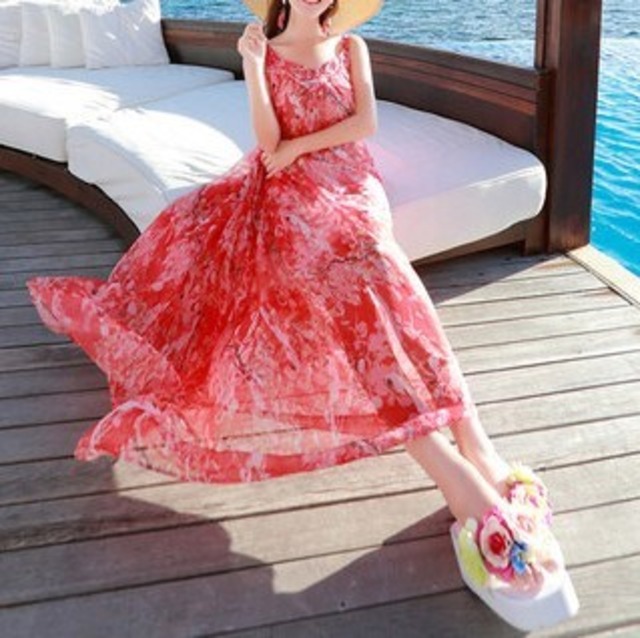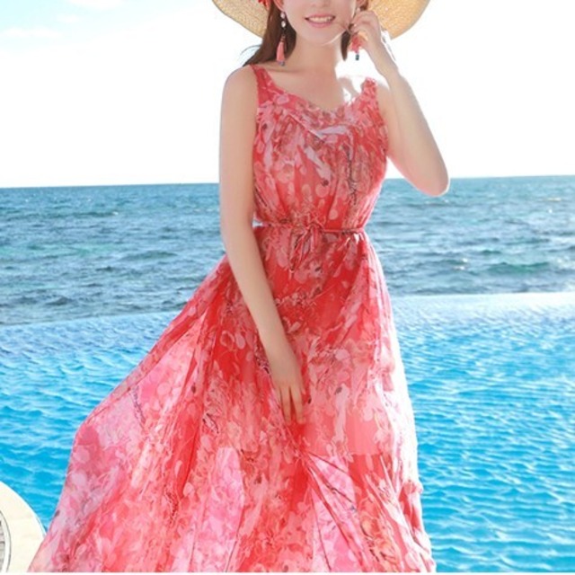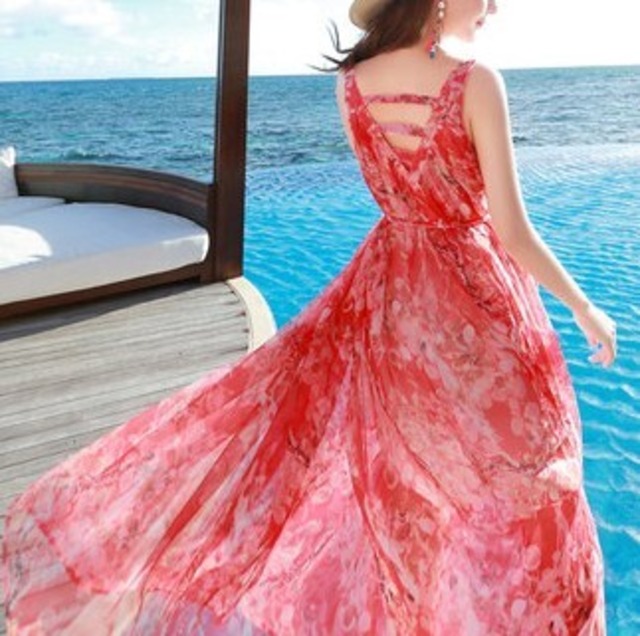 赤い花柄のリゾートロングワンピース♡背中のデザインがカワイイ♡Vネックのスッキリ感とウエストリボンでやせ見え効果も〇♡