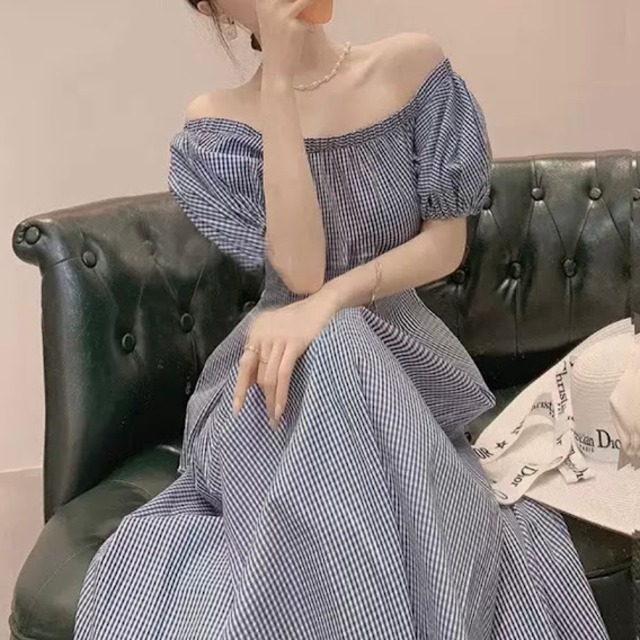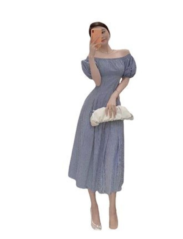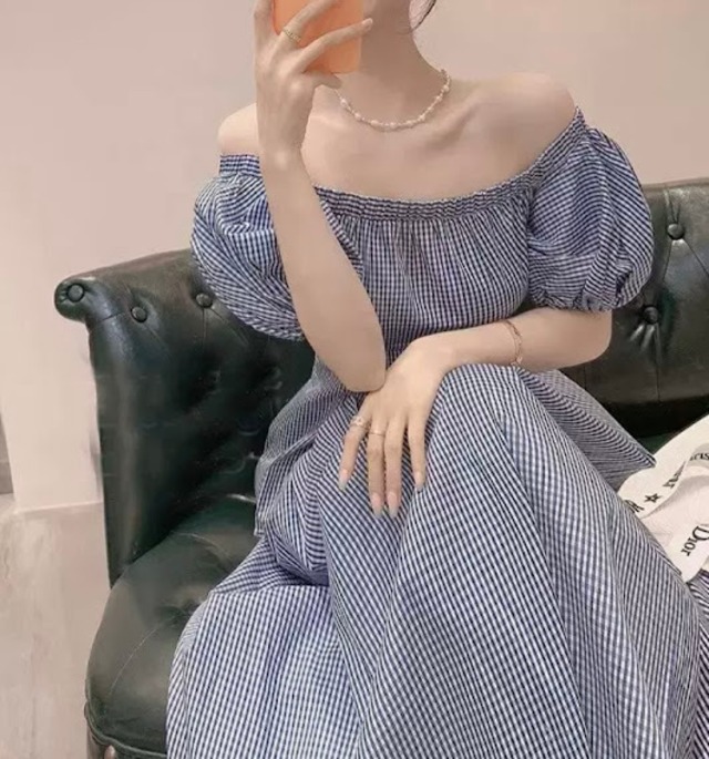 細かいギンガムチェックが大人カワイイ♡オフショルダーのワンピース♡ネイビーの清涼感も印象度アップ♡