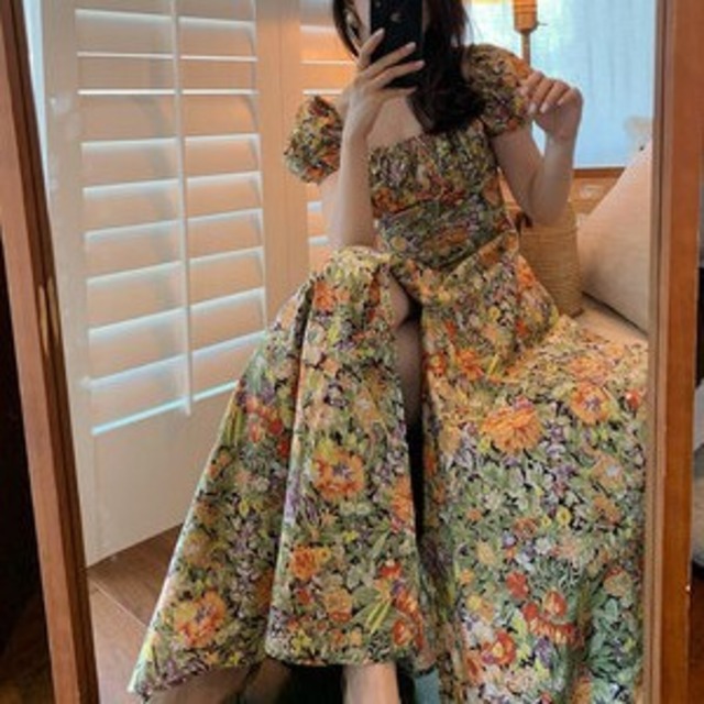 レトロ感な花柄がステキなオフショルダーワンピース♡胸元のギャザーがカワイイ♡パフスリーブを上げて着ても、下ろして着ても、どちらもカワイイ♡