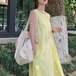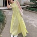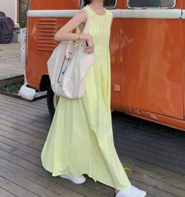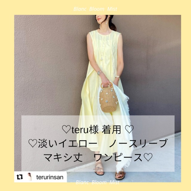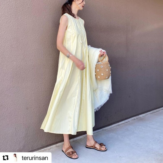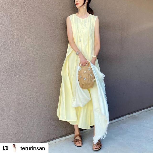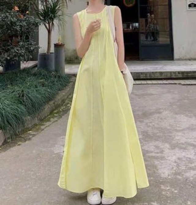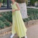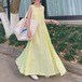 ネックから伸びたタックがカワイイ♡淡いイエローのロングワンピース♡スカートのフレアー感やスリットが大人カワイイ♡