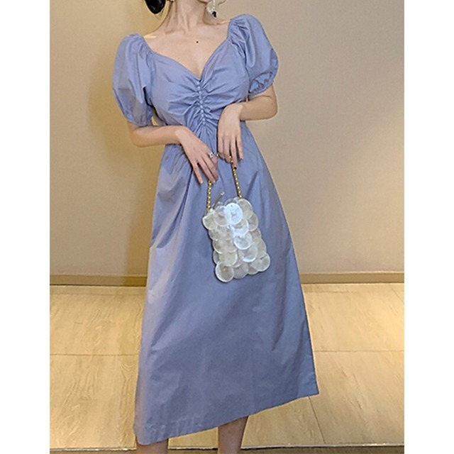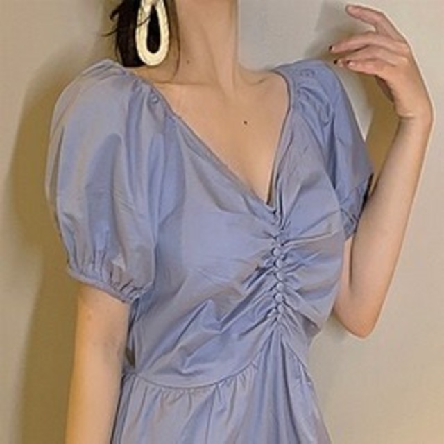 胸元のギャザーにあしらったボタン使いがカワイイデザイン♡Ⅴネックで清楚なワンピース♡