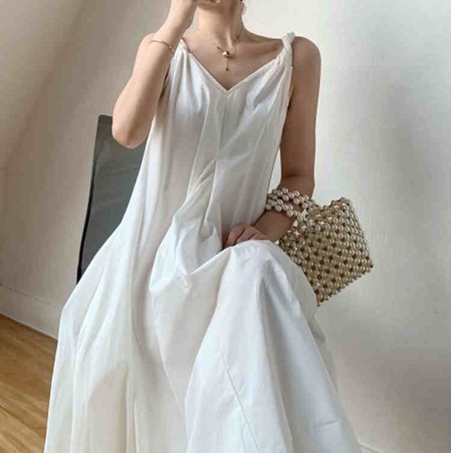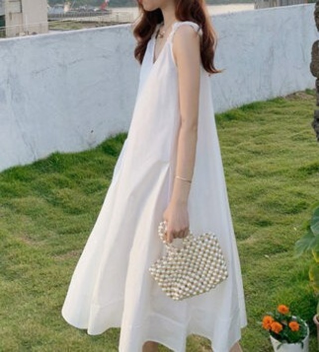 肩紐がツイストデザインでオシャレ♡Vネックでスッキリ着れるノースリーブのワンピース♡
