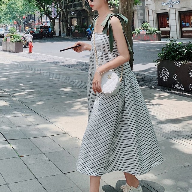 肩紐のリボンがカワイイ♡緑の水玉のキャミソールワンピース♡ティアードで涼し気♡