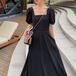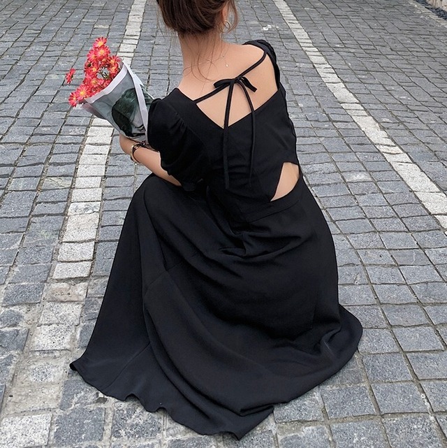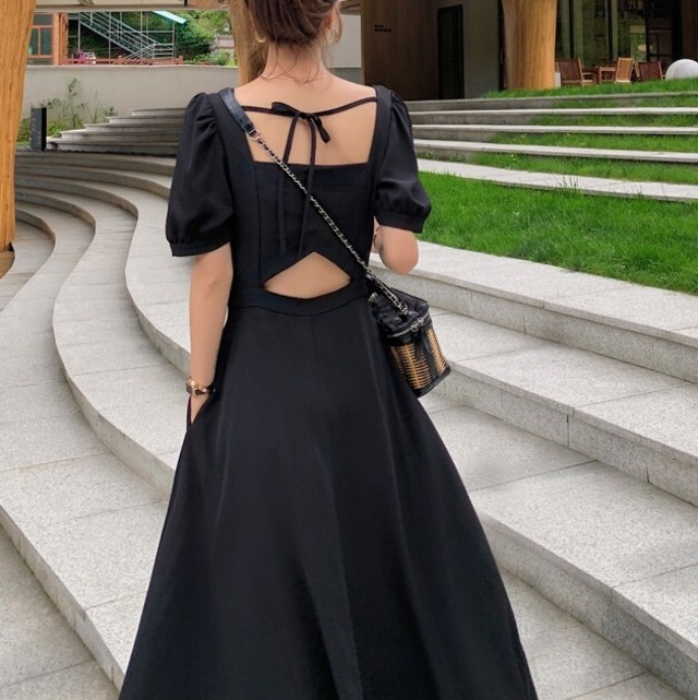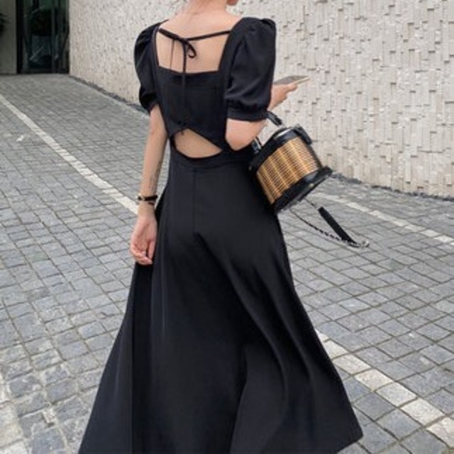 背中のリボンやウエストの空いたデザインがかわいいワンピース♡スクエアネックやパフスリーブも何気にカワイイ♡