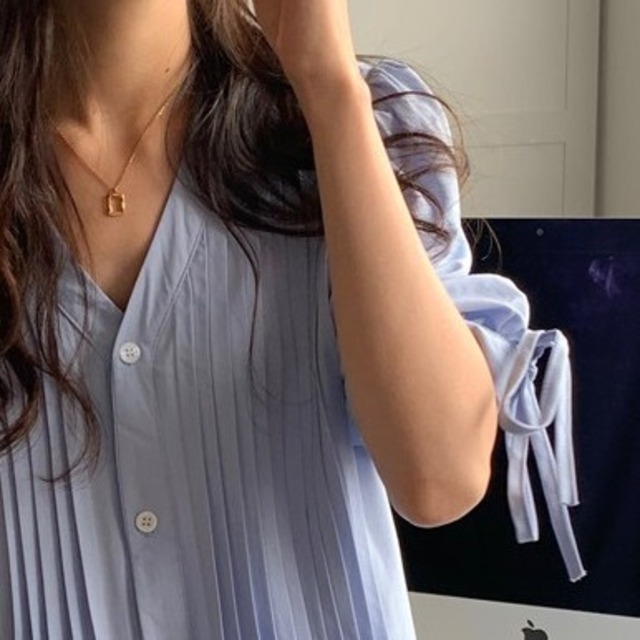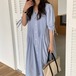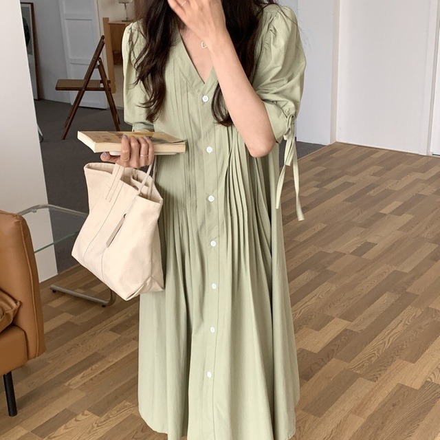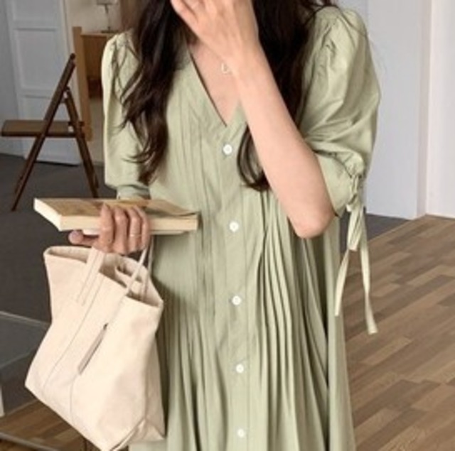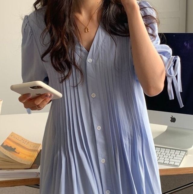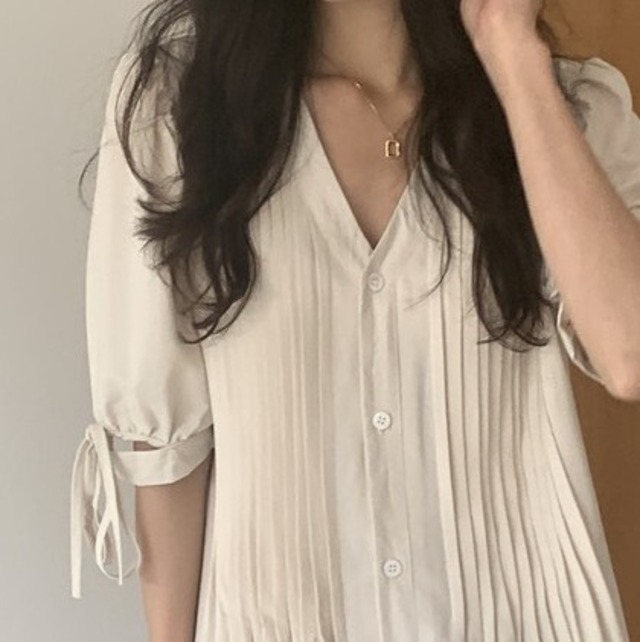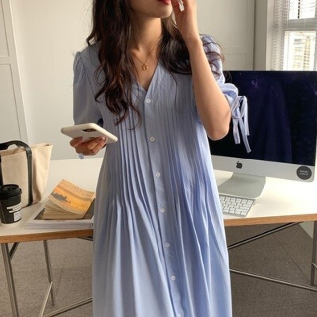 Vネックのサイドにほどこされたプリーツのデザインがさりげなくさわやか♡パフスリーブのリボン結びもめちゃカワイイ♡やさしいトーンの着やすいミドル丈のシャツワンピース♡