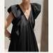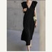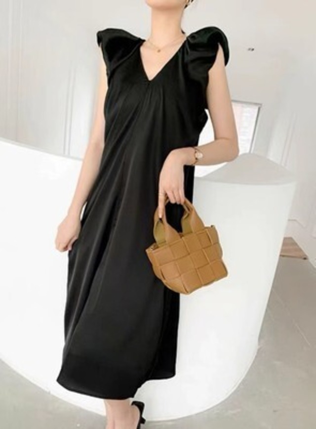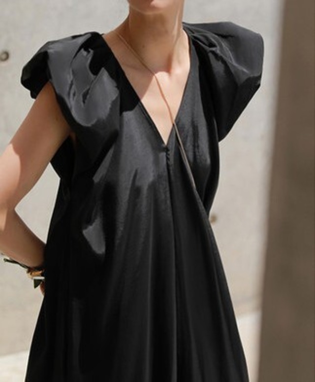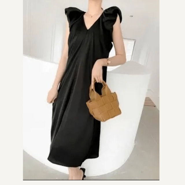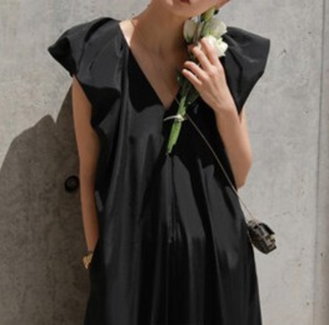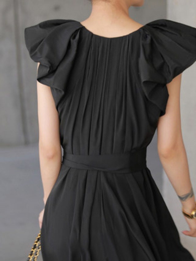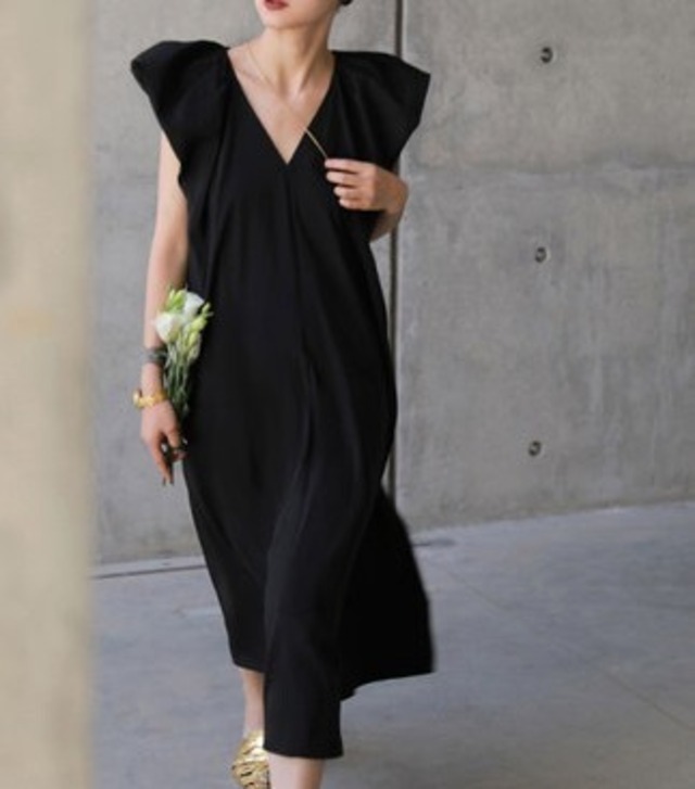 フリルフレンチなのにブラックだから大人カワイイ♡Ⅴネックでスッキリしたフロントとギャザーのバックのデザインもカワイイ♡ハイエンドなワンピース♡