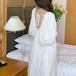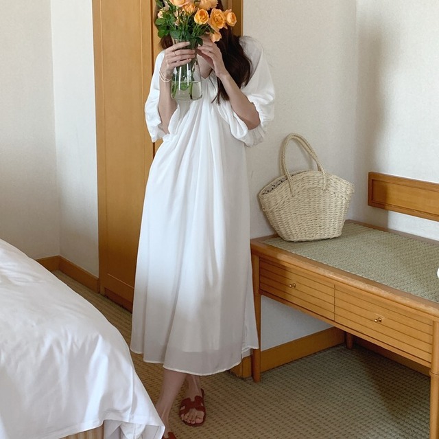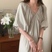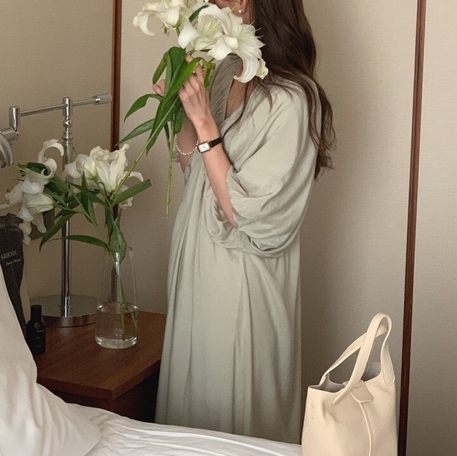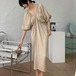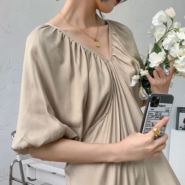 Vネックのドレープがかわいいワンピース♡ランタンススリーブでやさしい雰囲気♡背中のリボンもカワイイ♡シンプルながらもイメージで得するワンピース♡