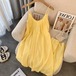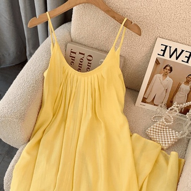 淡いイエローのロングキャミソールワンピース♡ラウンドネックからのギャザー感や後ろで結ぶ細いリボンがめっちゃカワイイ♡このロング感も魅力的♡