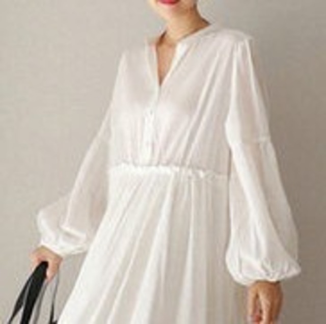 着やすいルーズデザインの長袖ランタンスリーブのワンピース♡Vネックとハイウエスト切替でスタイル映えするデザイン♡