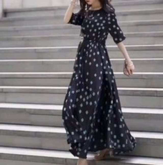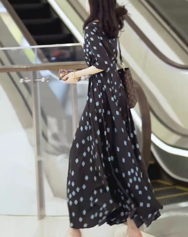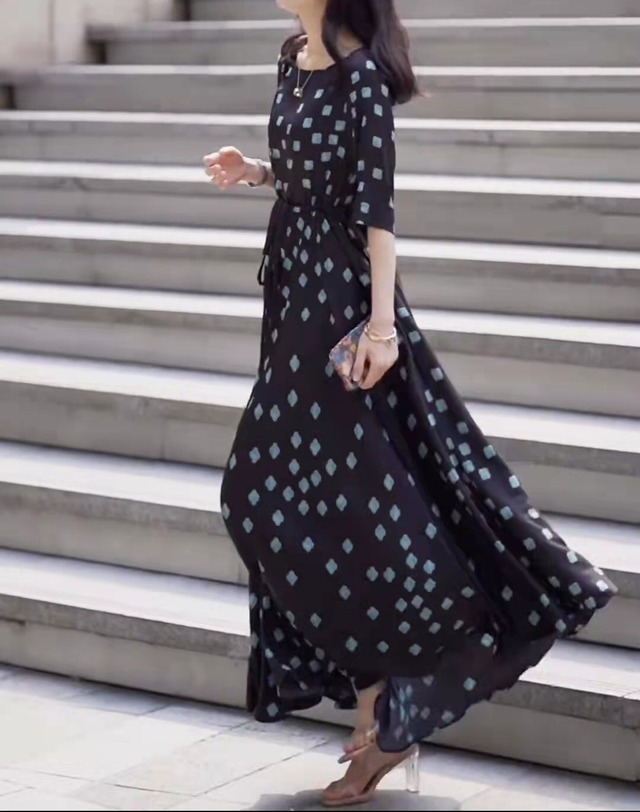 スクエアプリントがすっきりして大人カワイイ♡マルベリーシルク混のハイエンドなワンピース♡ウエストのリボンでやせて見える♡動くたびにまとわるシルエットが魅力的♡