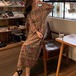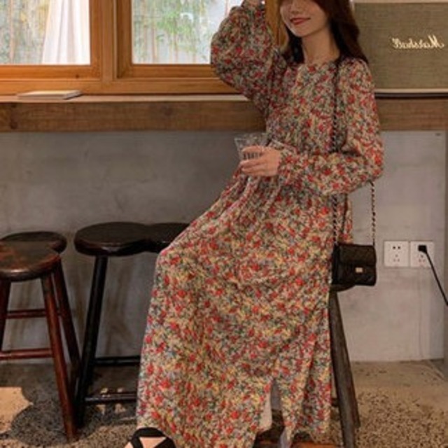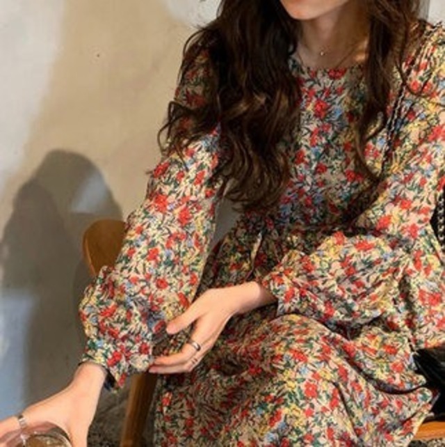 レトロな花柄が大人カワイイ♡ルーズシルエットのワンピース♡長袖のパフスリーブも愛らしい♡