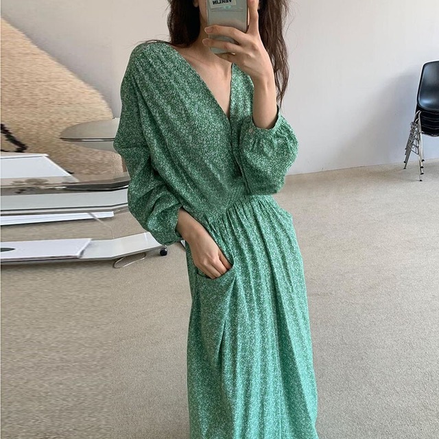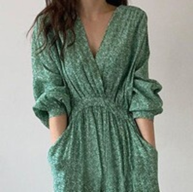 グリーンの花柄が清潔感♡ウエストタックのカシュクールでスリム効果♡印象がイイワンピース♡