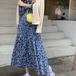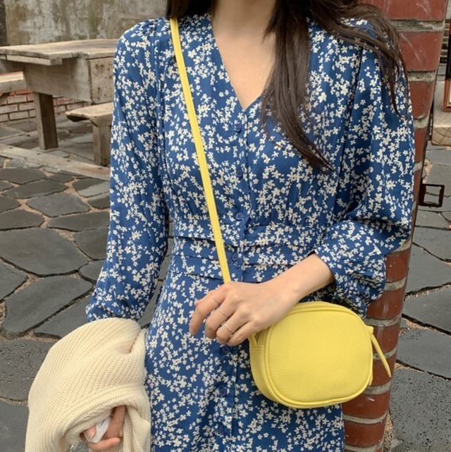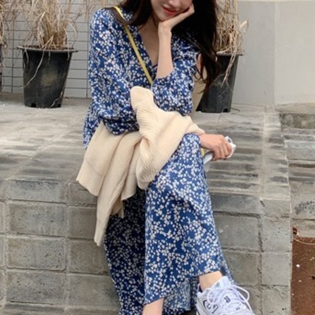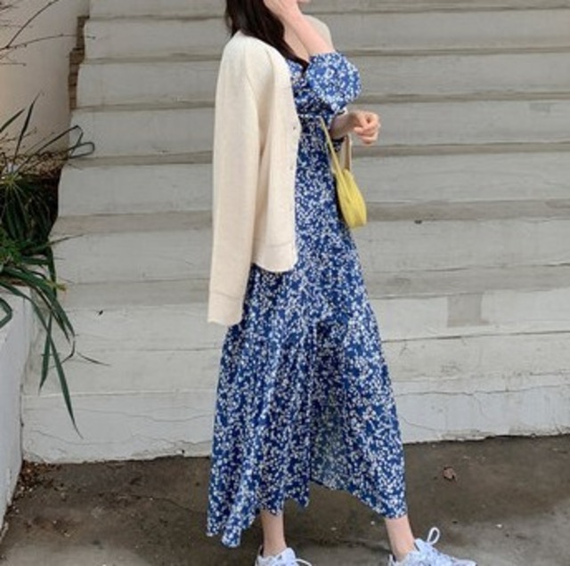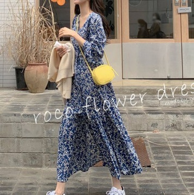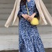 ミモザ風のブルーの花柄がさわやか♡前ウエストがタックデザイン♡後ろがシャーリングで楽々なのにカワイイ♡スニーカーコーデにもピッタリなワンピース♡