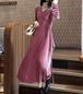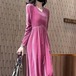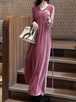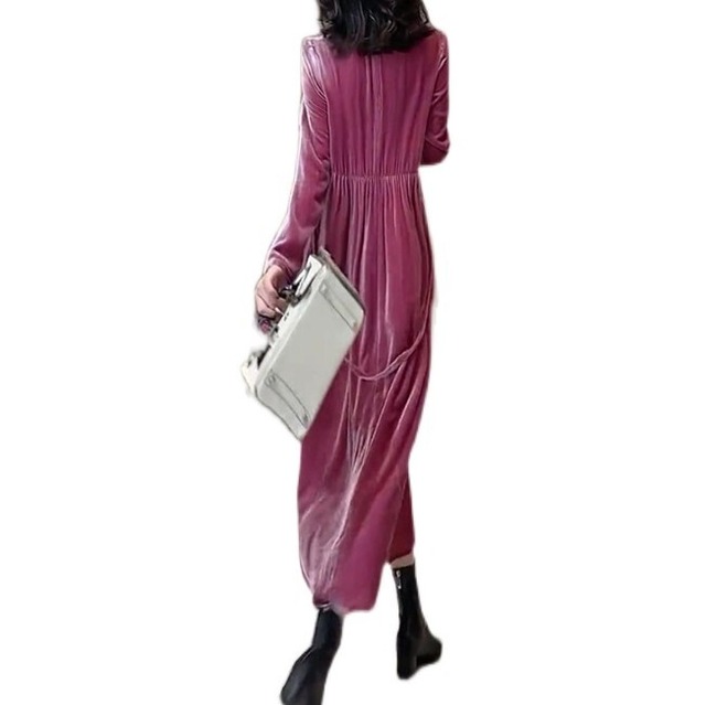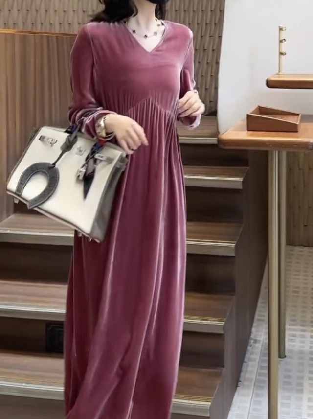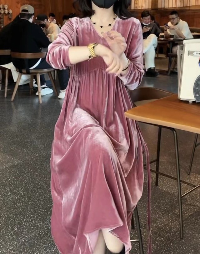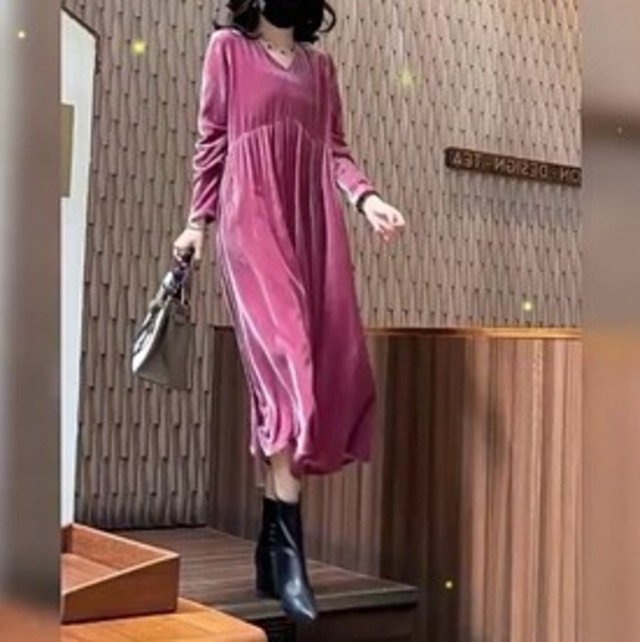 ピンクゴールドのベルベット素材がカワイイ♡ハイウエスト切替のギャザーワンピース♡