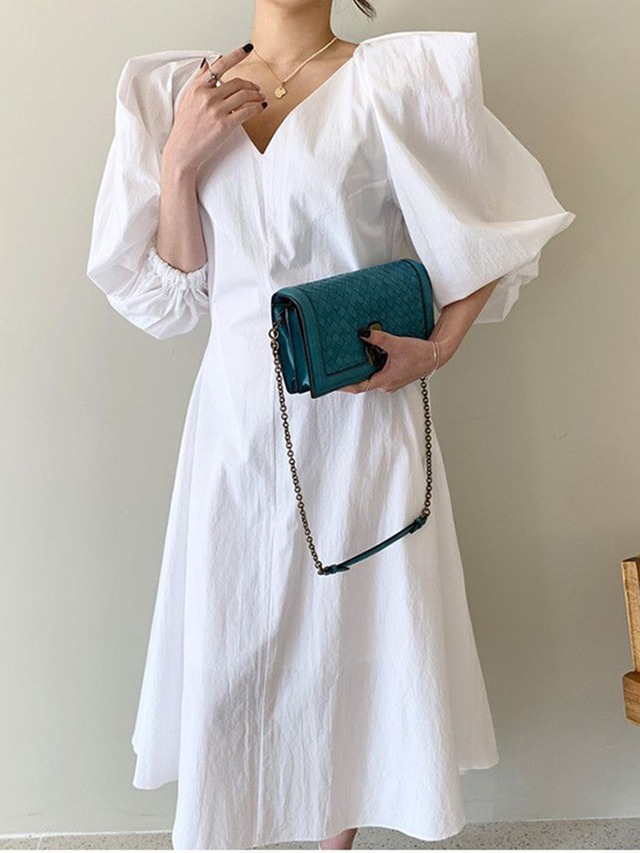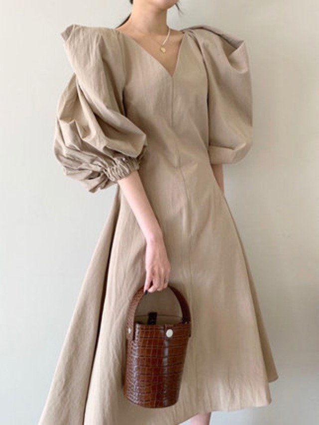 上品なイメージ♡パフスリーブのシルエットが美しい♡Ⅴネックのミドル丈ワンピース♡