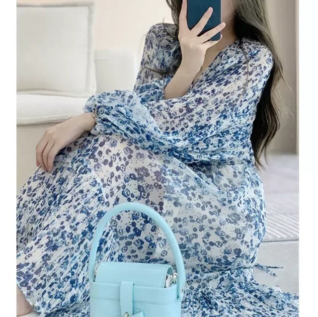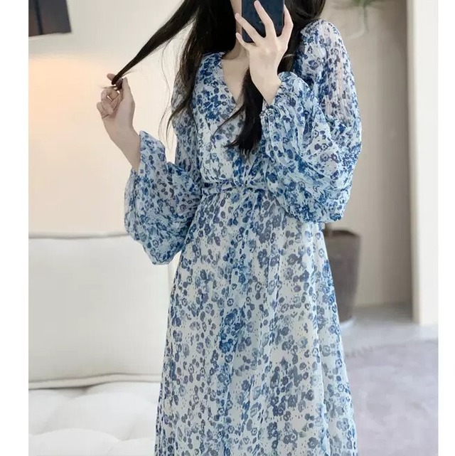 上品なブルーの小花柄♡ランタンスリーブのワンピース♡シフォンのやわらかさが大人カワイイ♡