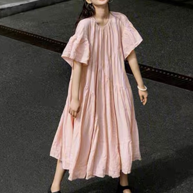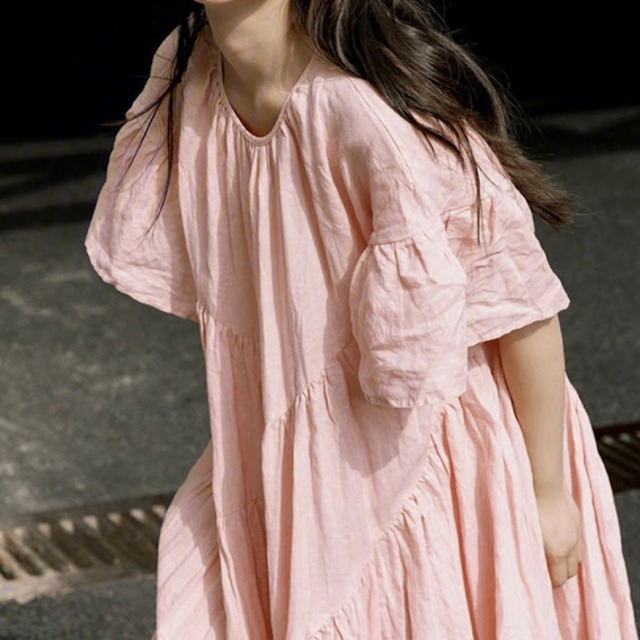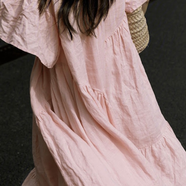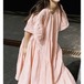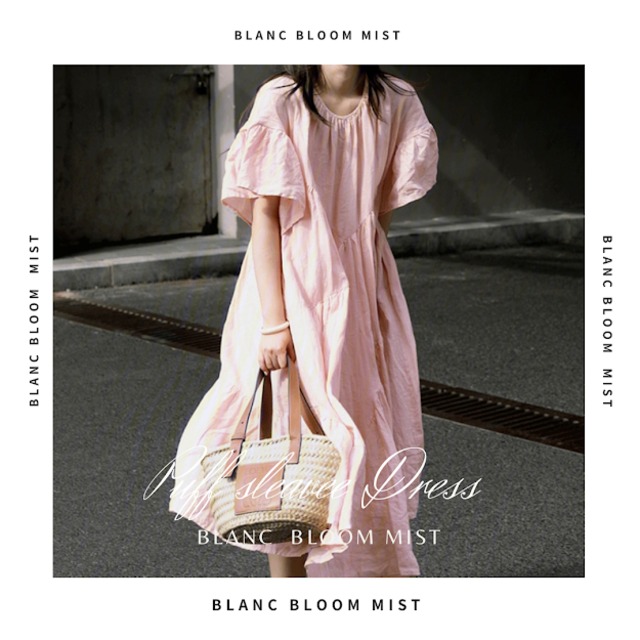 淡いパウダーピンクが女性らしくてカワイイ♡コットンリネンのパフスリーブワンピース♡快適な着心地とフェミニンなシルエット♡デートや女子会、リゾートでも活躍してくれる、着回し力抜群のワンピース♡